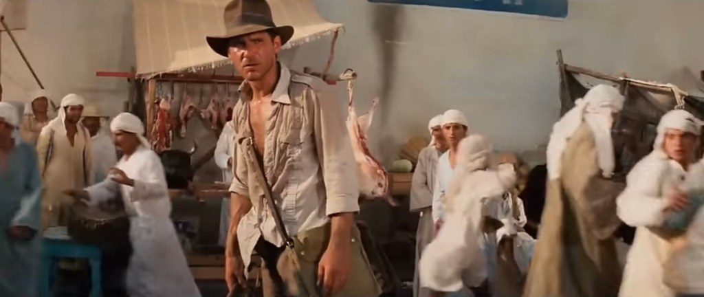 The film is a masterclass in pacing and action. Spielberg delivers set-piece after set-piece with expert timing and choreography, from the boulder chase in the opening sequence to the truck fight in the desert. Each moment is crafted with practical effects, tight editing, and a strong sense of geography, making the action not only exciting but clear and coherent. John Williams’ rousing score, especially the now-iconic “Raiders March,” heightens the sense of adventure and heroism.