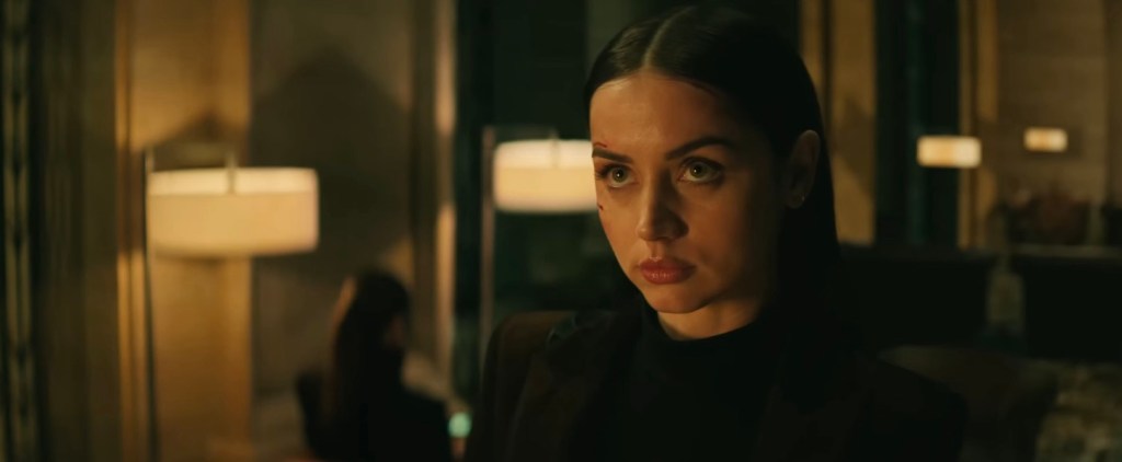 Eve’s journey is similarly sketchy. While Ana de Armas brings physical commitment and stoic intensity to the role, the character of Eve feels emotionally inert. Flat, even. There are glimpses of humanity, but they’re fleeting, overwhelmed by a revenge plot that’s more procedural than personal, and more often contrived to the point of annoyance. Considering her trauma and the potential depth of her backstory, it’s disappointing that Eve often feels like a series of well-lit stares rather than a fully realized person.