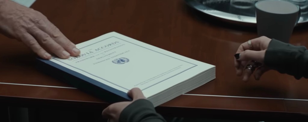 Captain America: Civil War is not an adaptation of this. It borrows the silhouette and discards everything that gives the comic its identity. The Sokovia Accords do not register heroes as weapons, but instead create consequences and accountability for superhero operations by proposing UN oversight of Avengers operations. This becomes the central conflict that creates the idealogical rift between Steve and Tony, while Bucky Barnes’ narrative from Winter Soldier perfectly dovetails into this, deepening the growing personal conflict between the two leading Avengers. This shifts the conflict from governance in the early to mid film, to an exploration of grief through the lens of the repurcussions of the Avengers international actions. The film is not interrogating state power, but rather it dissects the collapse of a found family and explores grief and revenge in a world of superheroic titans.